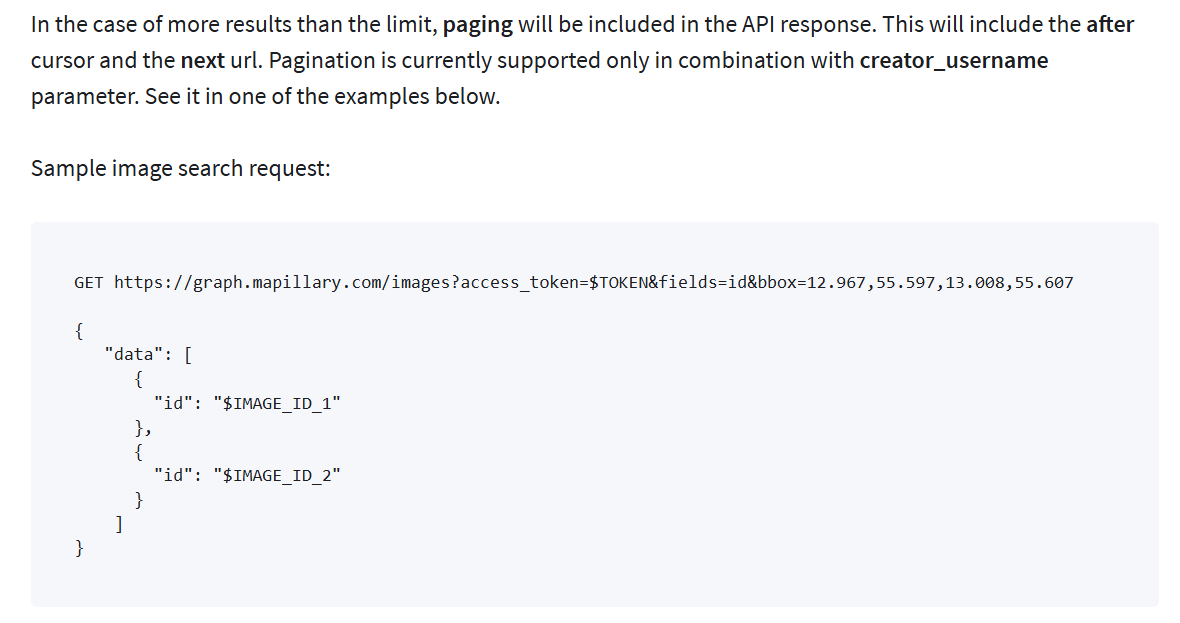 Using the Mapillary API was a little difficult for me due to my inexperience with web sessions, but their documentation made the requesting understandable. Essentially, you ask for all the image information in a box that is dictated by the minimum and maximum latitudes and longitudes of the desired area. That returns a list of metadata that includes the associated image IDs. You then send a follow-up request to download the images as JSON objects via their image ID. The only caveats to this process are the limit to area size (0.01 square-geographic-degrees, which is huge) and the maximum image count of 2000 images. I did run into some confusion with the wording about pagination of responses regarding the 2000 image limit. Initially I thought the types of requests I would be sending would require me to follow up with a “Next Page” response, but after some careful reading of the documentation I believe this is only necessary if a sub-user is accessing the API via my access token.